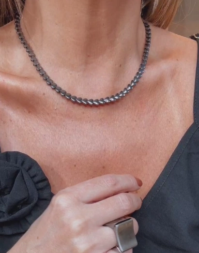 Colar Hematita Pedra natural no formato de Coração, comprimento de 43cm + 10cm de extensor, fecho lagosta, banho onix com verniz antialérgico. Por ser pedras naturais, podem haver pequenas alterações de cor em relação as imagens da foto.